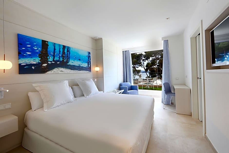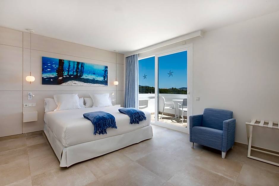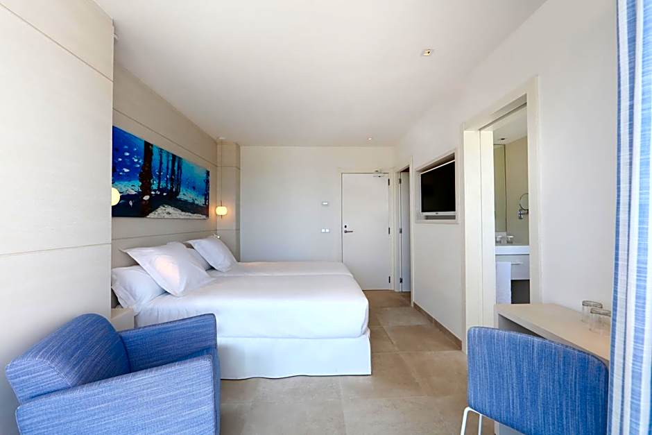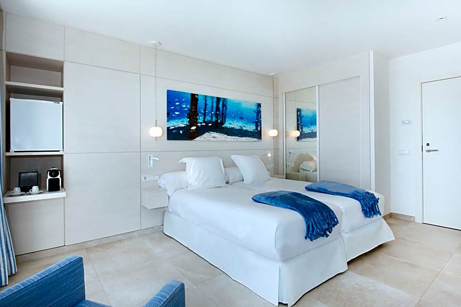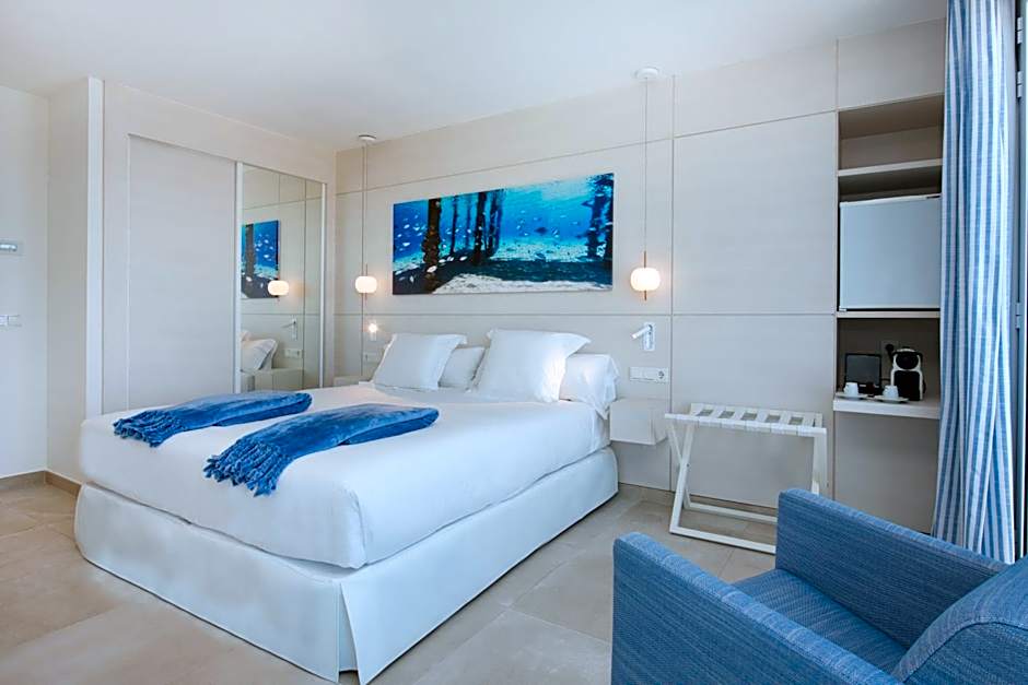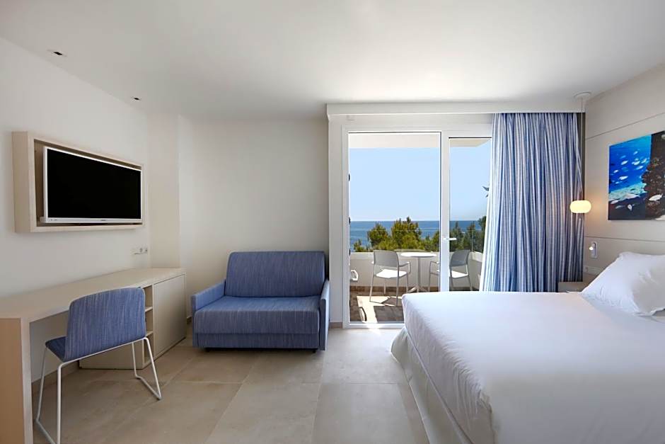 This Star Prestige Double room with side sea view has a balcony and air conditioning. It has a 42" TV and a private bathroom with shower, hairdryer, bathrobe and slippers, as well as beach towels. It also has a safe and mini-bar (with charge), two types of pillows and free Wi-Fi.